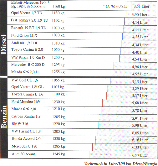 In Russland fuhr ein leichteres russisches Auto mit demselben Elsbett-Motor (1,45 Dreizylinder TDI, 90 PS) auf der Strecke Riga - Moskau etwa zur selben Zeit mit einem Durchschnittsverbrauch von 2,9 Liter auf 100 km. Da der Motor aber in diesem Fahrzeug nicht mehr serienmäßig zum Einsatz kam, sei es nur einmal nebenbei erwähnt. Die Daten sind allemal nennenswert.